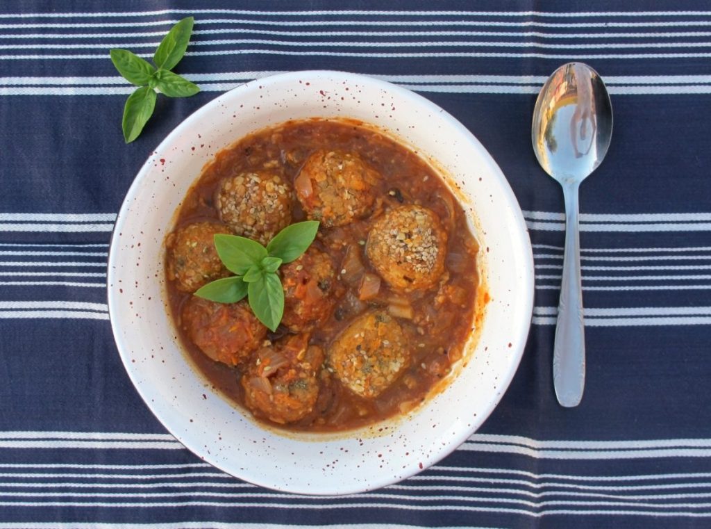 La combinación de albahaca y tomates secos no requiere de mis servicios de abogada defensora: lo único que puedo agregar es que estas albóndigas quedan como debe ser, húmedas y tiernas, pero sin desarmarse solas antes de ser atacadas con el tenedor. Y eso aunque no tienen nada de carne, porque la pasta se hace con garbanzos.