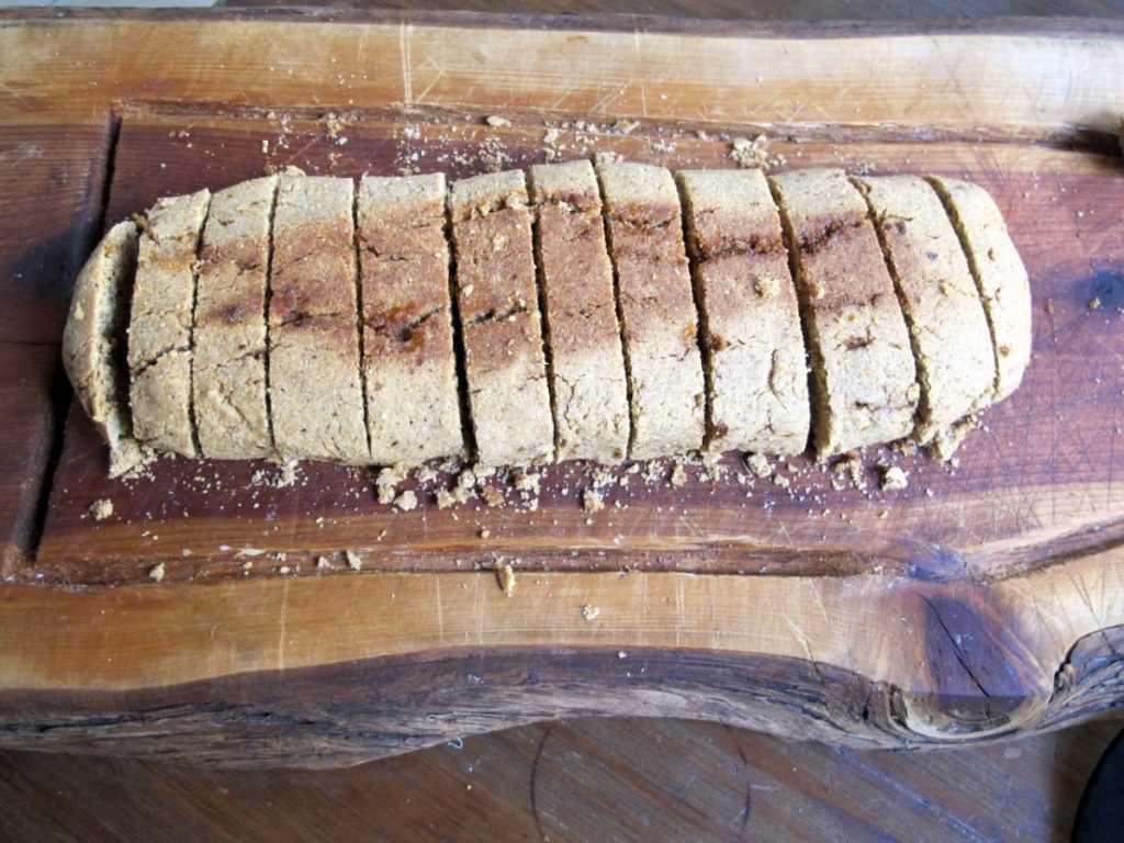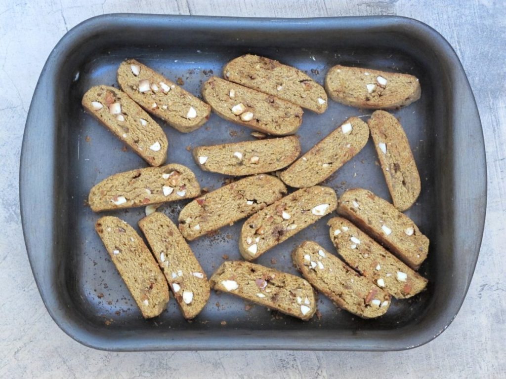Cortar en rodajas de unos dos centímetros de ancho, o a gusto, y volver a hornear unos diez minutos, volteando a la mitad cada biscotti para terminar de tostarlos en sus dos lados.