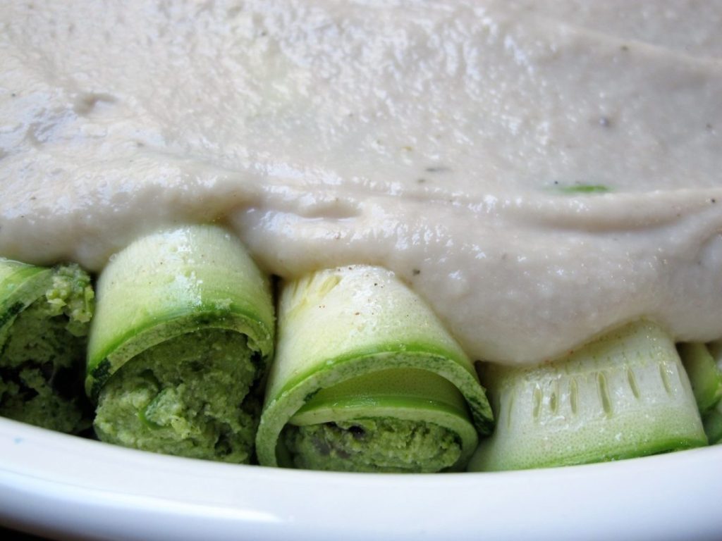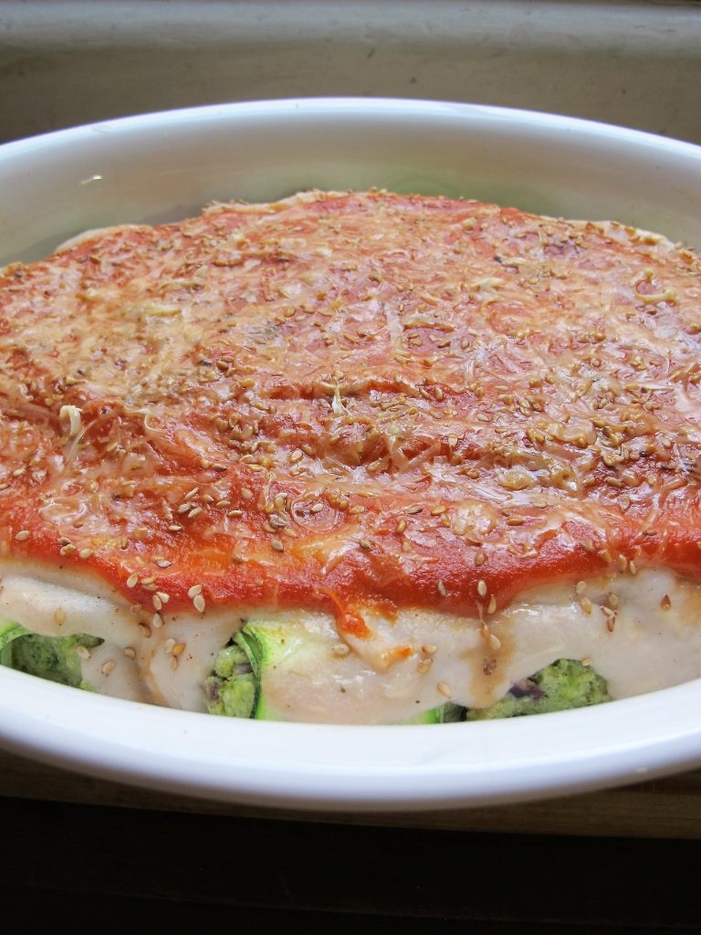 Cortar los zucchini en láminas finas. Lo ideal es usar mandolina para lograrlo, pero si no, se hacen con paciencia y buen cuchillo. Se pueden usar crudas o pasar un instante por el vapor que usaron para el brócoli, a gusto. Podrían usar láminas de berenjena, pero ahí deberían grillarlas o pasarlas por vapor para cocerlas antes.