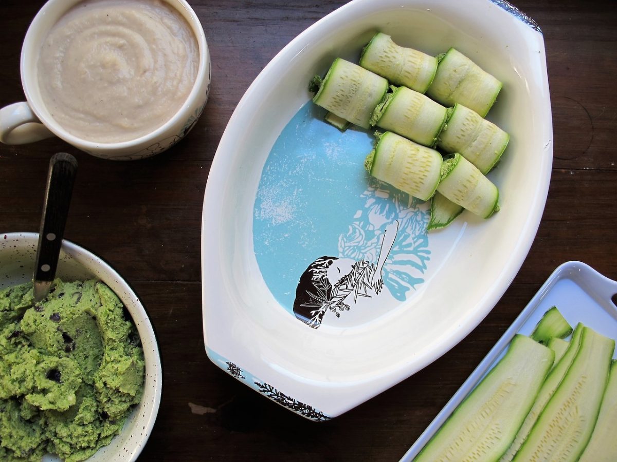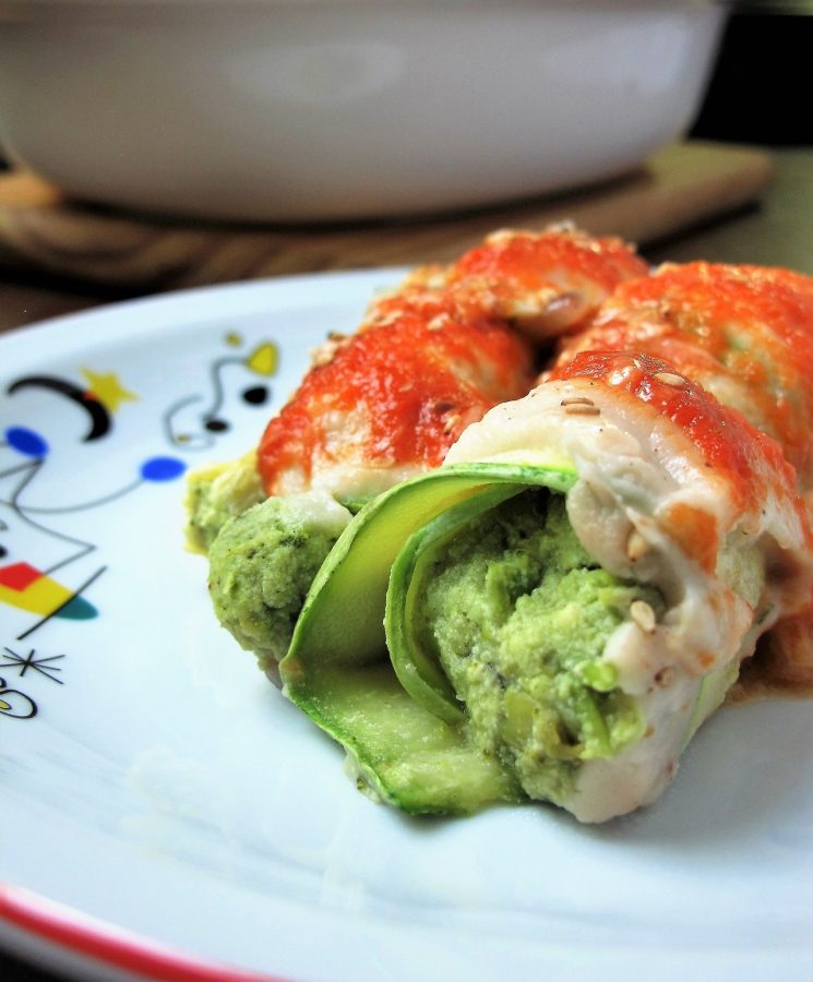 Cortar los zucchini en láminas finas. Lo ideal es usar mandolina para lograrlo, pero si no, se hacen con paciencia y buen cuchillo. Se pueden usar crudas o pasar un instante por el vapor que usaron para el brócoli, a gusto. Podrían usar láminas de berenjena, pero ahí deberían grillarlas o pasarlas por vapor para cocerlas antes.