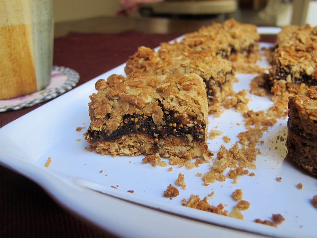 Para la masa 1/3 taza de azúcar mascabo ½ taza de aceite de coco ¾ taza de avena arrollada ¾ taza de harina integral o la harina de tu preferencia ½ cdta de canela 1 pizca de: nuez moscada, clavo, jengibre ¼ cdta bicarbonato de sodio Para los rellenos - de Dátiles: 1 ½ tazas de dátiles y ¾ taza de agua - de Membrillo: Dulce de membrillo en barra, aprox. 1 y ½ a 2 tazas; 2 cdas de agua o jugo de limón - de Higos: 1 ½ tazas de higos secos y ½ taza de agua - de Manzana y Pera: ½ taza de pasas remojadas y 1 taza de dulce casero de manzanas y peras (puede ser incluso la pulpa de manzanas asadas)