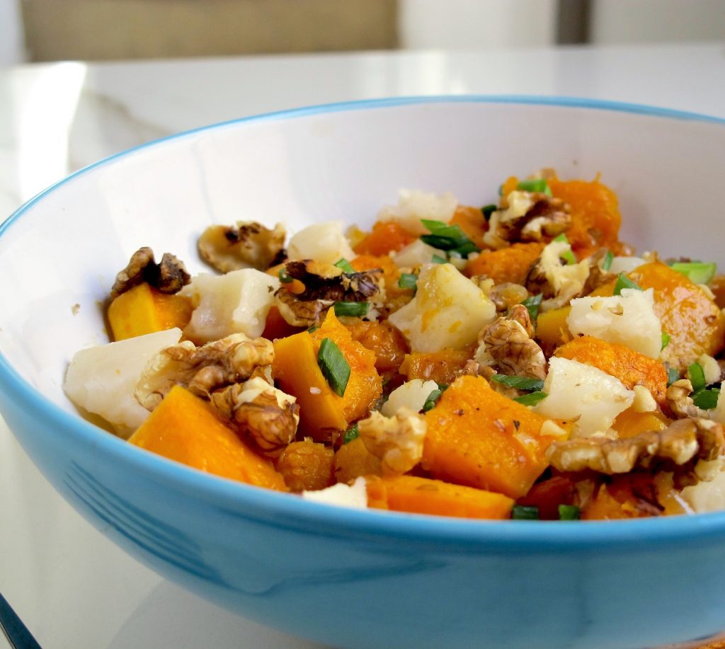 - 2 1/2 tazas de zapallo cortado en cubos rústicos - 1/2 taza de echalotes picados finos, o cebolla, o la parte blanca de la cebolla de verdeo - 1 diente de ajo (opcional) - 2/3 taza de queso feta (o algún otro queso de cabra, o el que prefieran) - nueces tostadas, un puñado a gusto - 2 cucharadas de miel - verdeo picado fresco, 3 cucharadas - sal, pimienta, oliva c/n - opcionales: pizca de canela, gotas de aceite de sésamo.