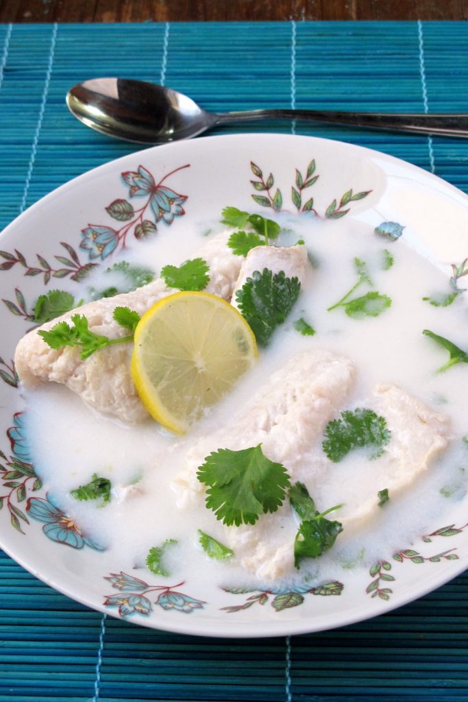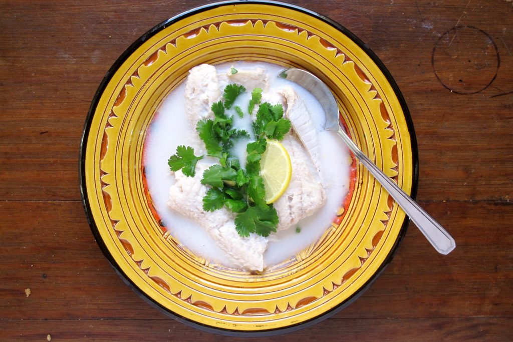 Si uno recién está aprendiendo a encontrar ese equilibrio, una buena idea es empezar con recetas misericordiosas, ésas que de algún modo contribuyen a mantener el plato en condiciones decentes aunque el cocinero trastabille. Esta es una de esas recetas: pescado en salsa de coco. Como el pescado se cocina despacito dentro de la leche de coco, queda siempre hidratado y cremoso. También es más fácil controlar el tiempo de cocción en líquido. La salsa lleva bastante limón así que no empalaga; y los que le tienen idea al pescado, pero no al coco, quizás superen el trauma pescadofóbico con su ayuda.