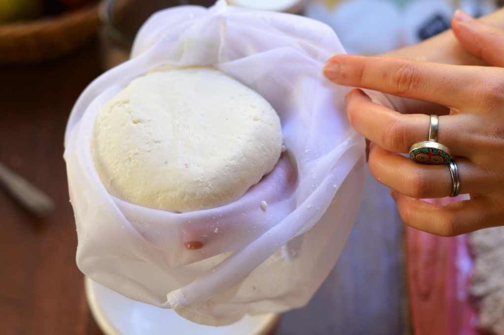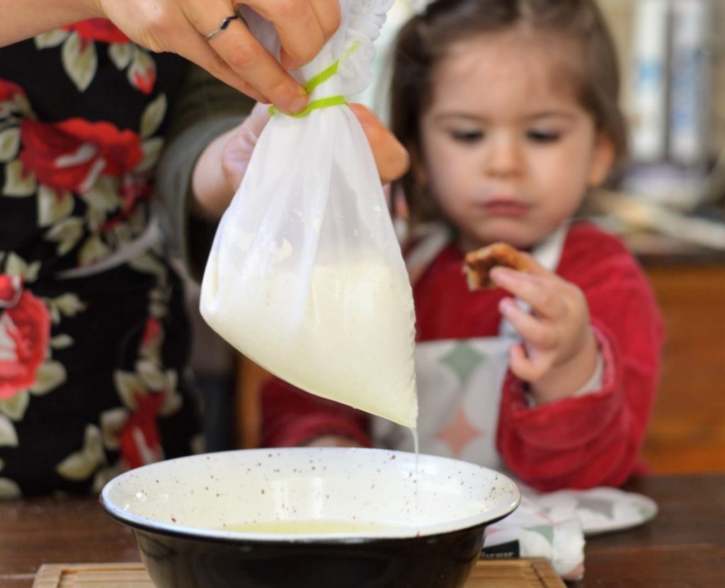 (es decir… quizás les conviene hacer el doble, no? Les paso esta base mínima para que calculen duplicar o triplicar según el uso que vayan a darle) - 1 litro de leche, preferentemente orgánica (puede ser descremada o entera, a gusto personal. También pueden usar leche de oveja o de cabra y quedaría una ricota espectacular). - jugo de medio limón. Puede reemplazarse por cantidad equivalente de vinagre, me gusta más el sabor con limón pero en ambos casos es sutil. - sal a gusto. Van a necesitar también una bolsa de las que se usan para colar leches vegetales o hacer germinados, que se consiguen con facilidad en tiendas naturales y dietéticas. Si no, con una gasa o paño de cocina fino sobre un colador, van a poder lograrlo sin mayores problemas.