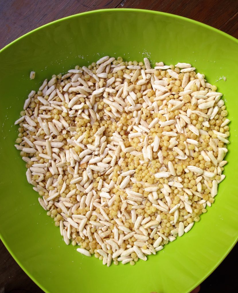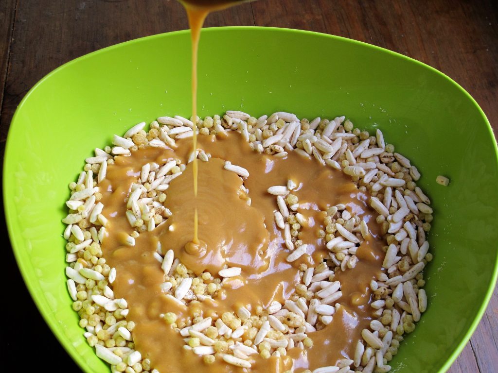 - 2 tazas de cereales inflados, preferentemente sin azúcar: usé 1 taza de arroz yamaní inflado y 1 de quinoa inflada, pero también he conseguido y usado amaranto, trigo, hasta maíz o pochoclo tradicional. Traten de elegir los que consigan sin azúcar o con mínima cantidad de endulzante agregado. - Hasta ½ taza de alguno de los siguientes o una mezcla: copos de maíz, mijo o arroz cocidos, avena precocida tostada, coco rallado o en escamas, almendras o algún otro fruto seco tostado y procesado. Pueden sumarse pasas de uva o ciruelas secas picadas, semillas de sésamo, chips de chocolate o lo que inventen. - 1/3 taza de manteca de maní (o de almendras, o de cajú, la que hagan o compren) - 1/3 taza de miel, agave o miel de arroz (puede ser maple syrup o algún tipo de almíbar o arrope que les guste). Con azúcar funcionaría pero deben disolverla bien en la manteca de maní y es difícil. Con stevia o algún otro edulcorante similar es difícil hacer funcionar esta receta porque les va a faltar “pegote”: tendrán que usar mucha más manteca de maní o aligerarla con ayuda de más aceite de coco, queso blanco o algo similar. - 1 cucharada o dos de aceite de coco. Puede obviarse.