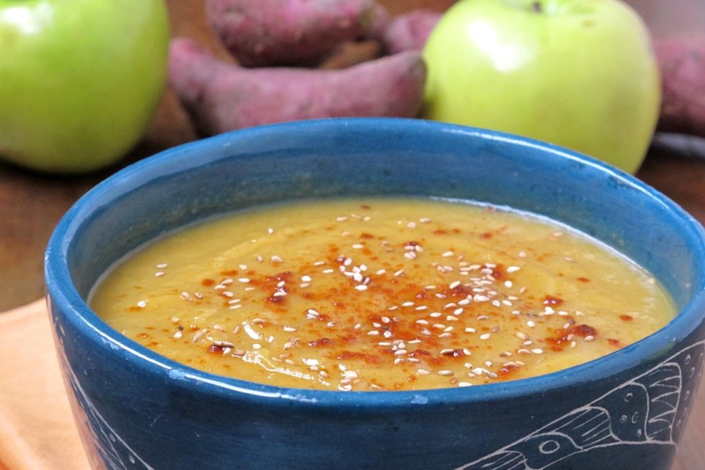 La idea inicial era hacer una sopa crema de calabazas y manzanas. Una cosa llevó a la otra. Para espesarla y acentuar el sabor dulce, por qué no agregar una batata (o camote). Con manzanas y batatas, enseguida surgió la canela, el jengibre. Y mucha pimienta… Cuando me di cuenta, tenía una combinación de gustos clásica de la India; eso que los chefs, los connoisseur y los snobs llaman “perfil de sabores”. La yunta de ingredientes dulces, el picante de las especias, la textura cremosa aligerada por la fruta… un gol de media cancha.
