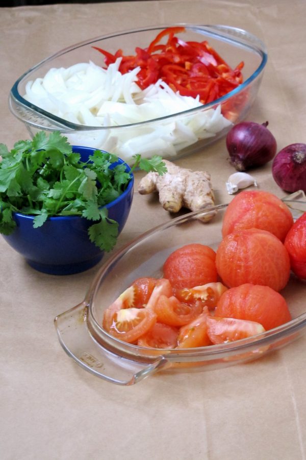 – cortar en octavos 1/2 kg de cebollas y 1 kg de tomates (pelados, mejor).