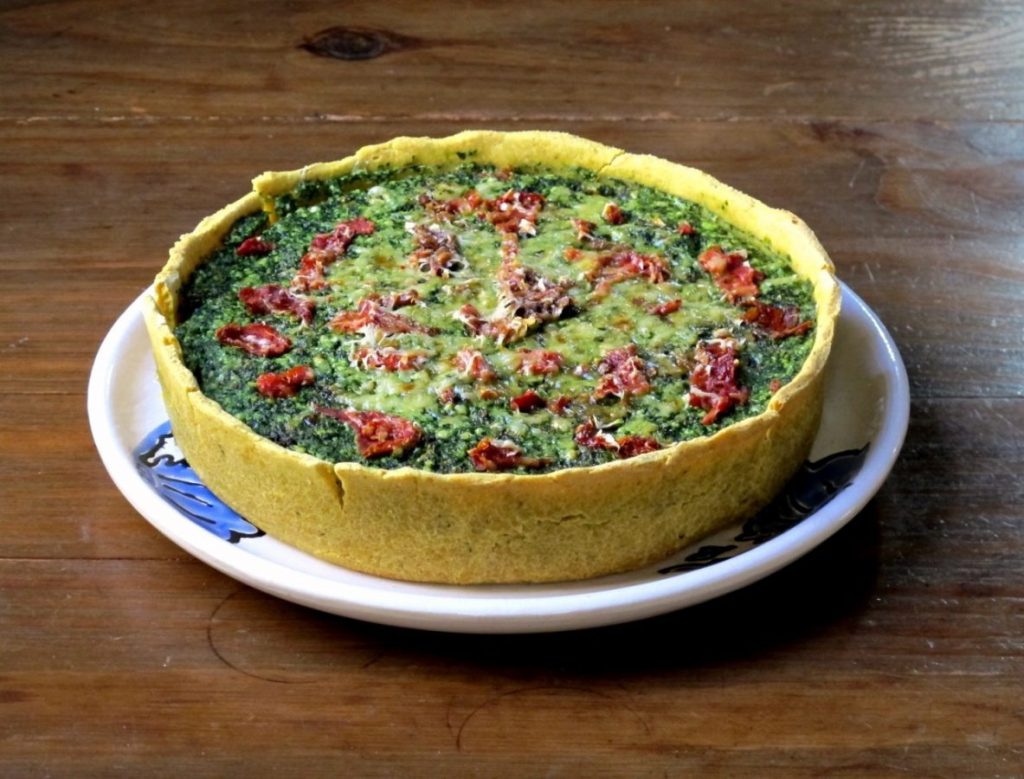 Esta tarta sigue ese mandato y cumple. Combina cosillas de varias recetas de tarta que ya posteé: la masa tiene un poquitín de ricota y se parece a otra de hace poquito, pero más simplificada aún. El relleno de espinacas se asemeja a la esponjosa del año pasado, pero tiene dos o tres rulos que le quedan mejor de lo que imaginé, como los tomatitos secos, que van divinamente.
