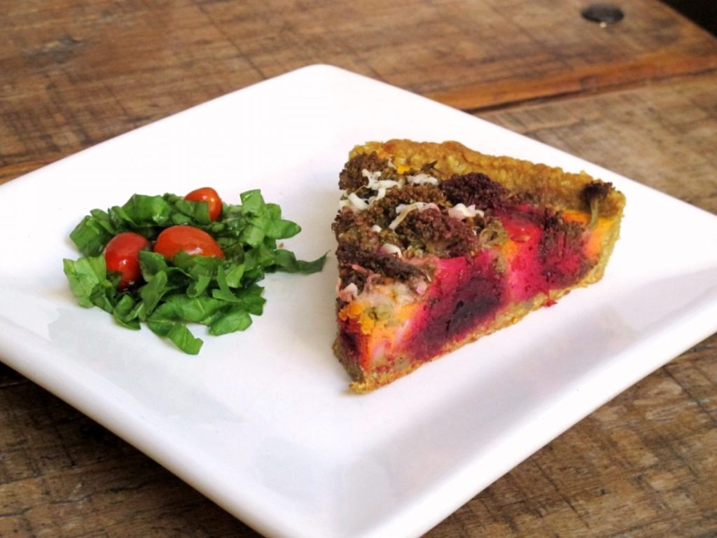 Aquí las tenemos entonces, rescatadas. Brócoli, remolachas y un ligue de zanahorias que fue el descubrimiento del día: una crema suavecita y dulzona que evita el huevo y los lácteos para los que así lo prefieran, y permite cambiar para los que simplemente se aburran de hacer siempre lo mismo. La masa es una variación de la que repito una y otra vez, desde que descubrí que da más fiaca ir a la esquina a comprar una tapa de tarta cualquiera, que preparar en casa la mía, mucho más rica y encima integral, con sólo 10 minutos. Pero el que prefiera ir por el camino de las góndolas, tiene luz verde. Y amarilla, y roja, siguiendo los cromatismos de esta receta.