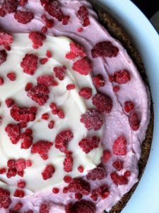 23 noviembre, 2017Bizcochuelo esponjoso de frutos rojos cubierto con crema bicolor de yogur de coco, chocolate blanco y frambuesa, relleno con la misma crema y frambuesas al natural, bordeado con corintos.