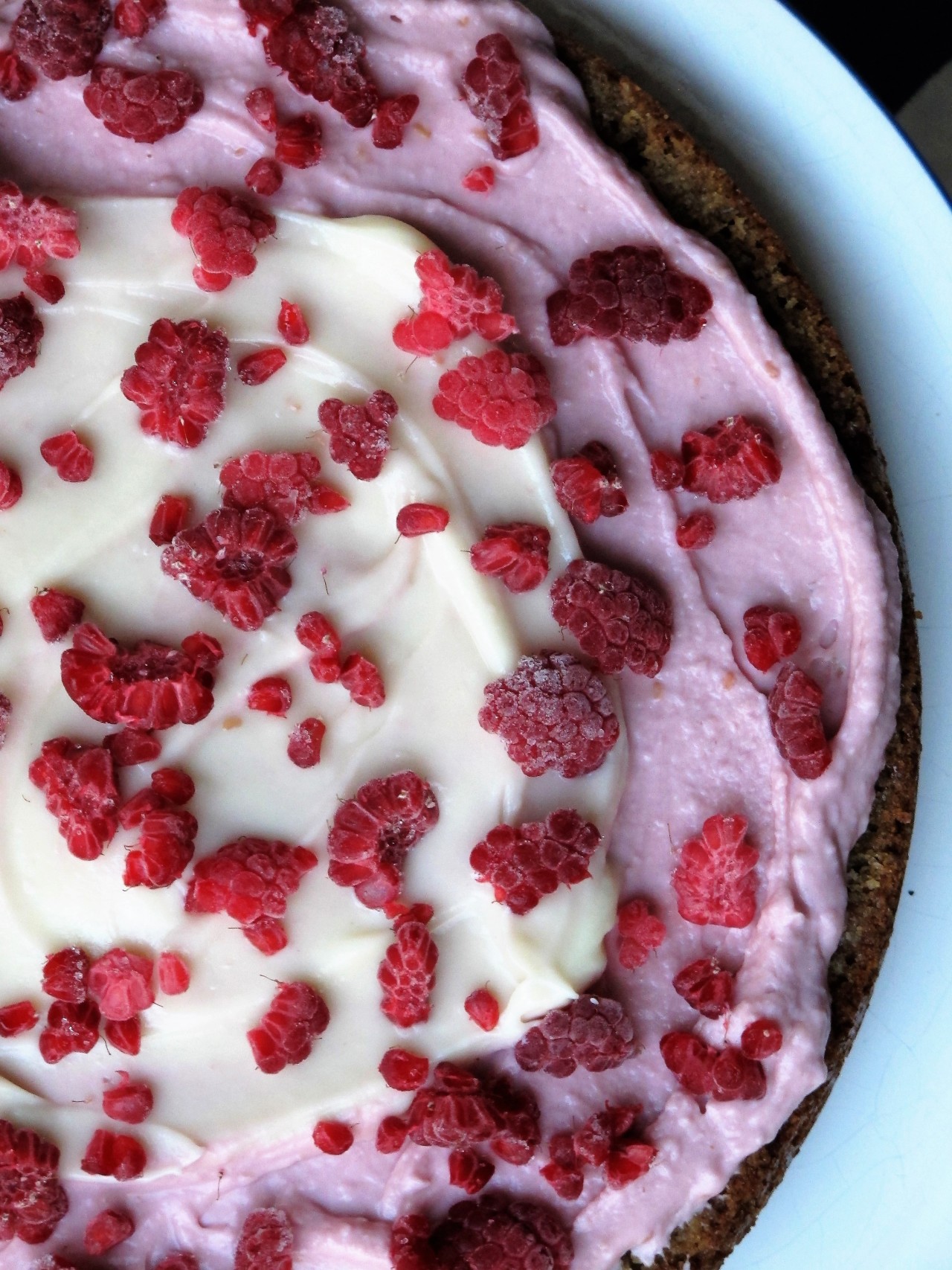 El relleno y cubierta son de una simpleza absoluta, tampoco me desvelaron ni los desvelará a ustedes, tranquilos. Combina increíble con el bizcochuelo: es una crema de yogur, chocolate blanco y más frambuesas. Como para aprovechar y experimentar un poco, usé un yogur de coco vegano y descubrí que sale… un espectáculo.