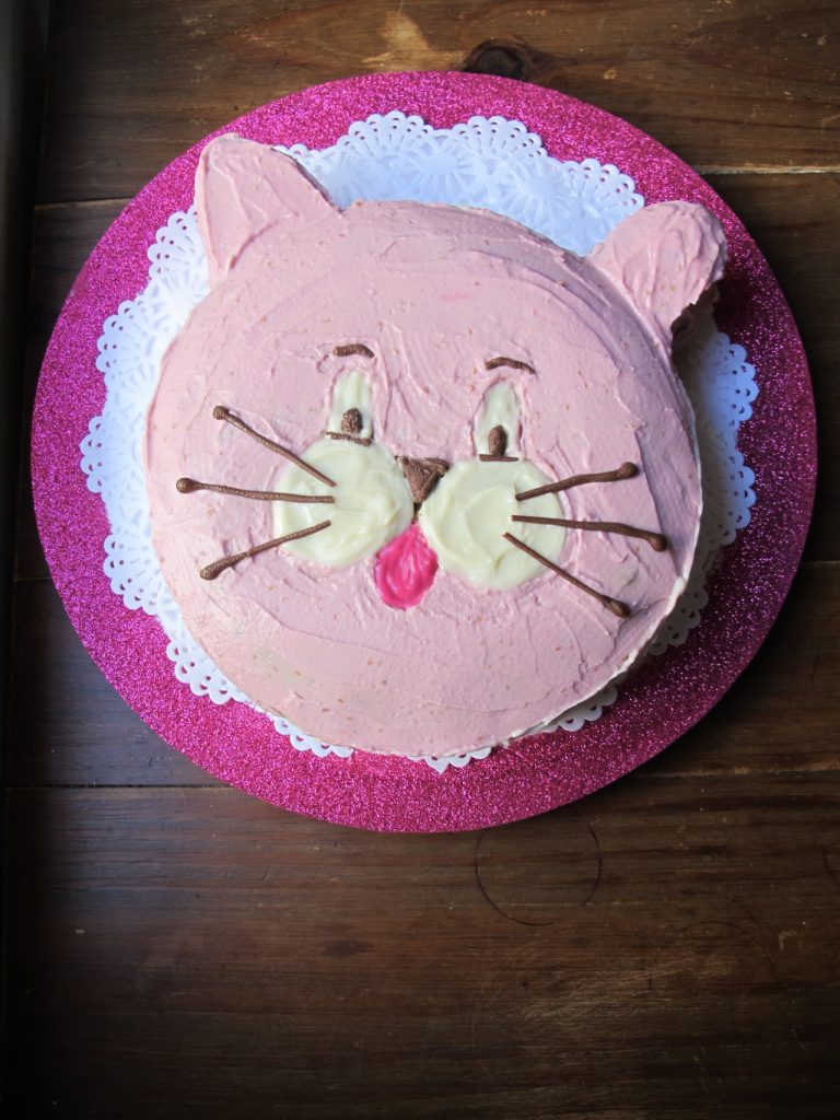 Ensamblado: Retirar la torta del freezer y cubrir la base con la crema más algunas frambuesas al natural enteras o al medio. Colocar la “tapa”. Para dibujar el gatito, sugiero dibujar primero el contorno de ojos, lengüita y cachetes suavemente con un palillo o cuchillito, y luego cubrir toda la superficie exterior y paredes de la torta con la crema rosa. El interior de ojos y cachetes se rellena luego con la crema blanca que reservamos aparte. Para los detalles de cejas, pupilas, bigotes y nariz usé chocolate negro derretido a baño maría y colocado dentro de una manga (o un sobre de plástico con una esquinita cortada que cumple la misma función).