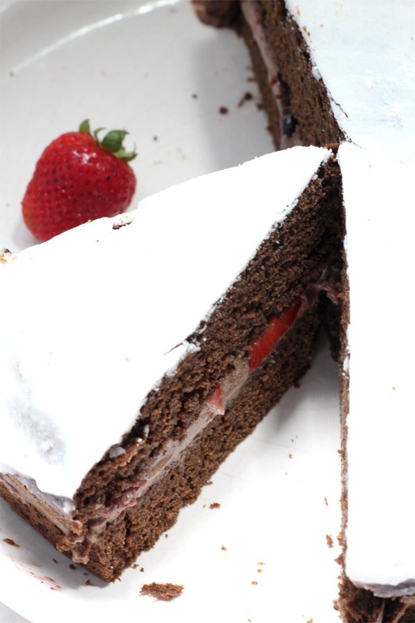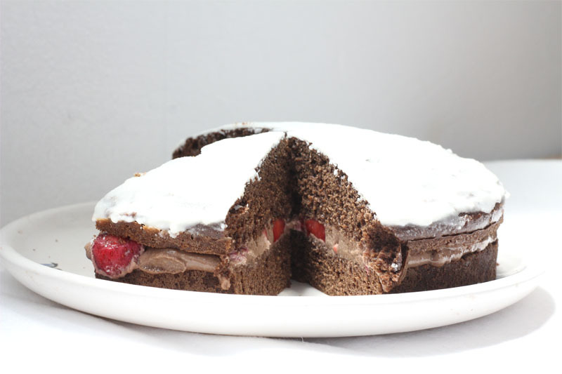 Cubrir la parte inferior con una capa muy generosa de la crema de avellanas y luego las frutillas cortadas en trozos. Colocar la tapa. Bañar la superficie de arriba con manteca de coco (para que esté líquida hay que calentarla un poquito, solidifica apenas toca el bizcochuelo frío). Si no tenés ganas de hacer manteca de coco casera, usá el glaceado que más te guste o ponele más crema de nutella.