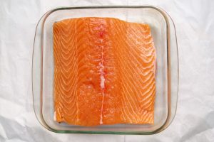 Poner el pescado con la piel hacia abajo en una fuente para horno. Cubrir con la salsa teryaki. mezclar los demás ingredientes (coliflor, especias, hierbas, limón y soja) y colocar con una cuchara sobre el salmón con teryaki. Si lo podés dejar reposar así una media hora, mejor. Si no, no hay problema.